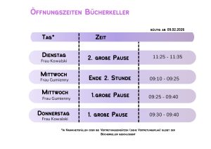 - Die Öffnungszeiten können im Laufe des Schuljahres variieren. Sie werden bei Veränderungen hier auf dieser Seite und an der Tür des Bücherkellers veröffentlicht.