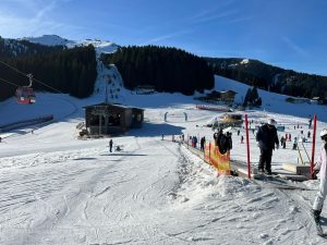 Die Fahrt in den Gondeln ging schnell und nach kurzer Zeit waren wir schon an der Piste angekommen. Alle Gruppen zogen ihre Skier an und warteten jeweils auf ihren Lehrer. Über den Tag heute haben viele Schüler ihr Fahren sehr verbessert, was die Lehrer (hoffentlich) glücklich macht. Am Anfang konnten viele noch keine einzige Kurve fahren, doch das verbesserte sich schnell. Adna wurde es sogar auf der normalen Piste so langweilig, dass sie sich entschieden hat, daneben in eine Wiese zu fahren. Nach der Mittagspause in strahlendem Sonnenschein sind die Gruppen verschiedene Pisten gefahren und es wurde auch viel trainiert, darunter Kurven fahren, oder auch coole Bewegungen oder Posen. Adna z.B. hatte ihre Arme verkreuzt, oder es wurde gejubelt beim Fahren, wenn wieder eine Kurve geschafft war.